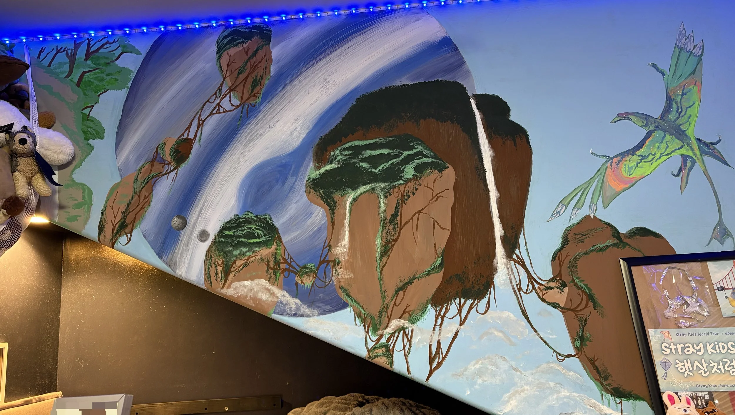 This piece of art is one that Id been thinking about doing for a while. It is a mural of the Hallelujah Mountains of Pandora from the movie Avatar (2009) by James Cameron. This movie is so beautiful and scientific which makes me extremely engaged in its message and visuals. I absolutely love this movie and all of the avatar movies to come. Im so excited to show everyone this mural thats taken me many months to complete. It is 6ftx4ft on my bedroom wall. The initial sketch took a few weeks to come up with but ultimately it came out pretty good. The painting process took many months and even now im still occasionally touching up my paint job to add minor details.