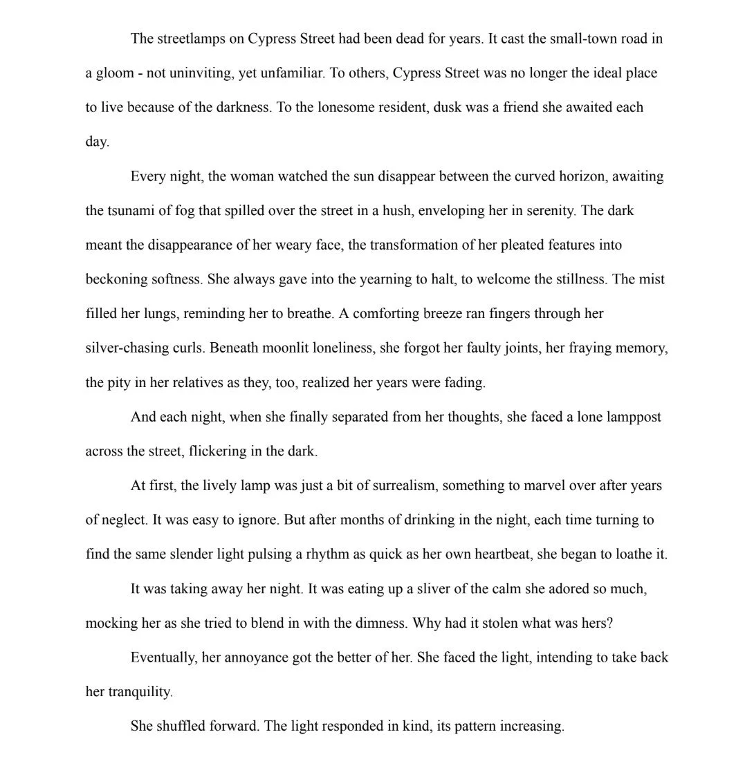 "The Lamp On Cypress Street" is an embellishing piece about the stillness and acceptance between life and death. Following an aging woman who finds comfort in the quiet moments of the night, a single, broken streetlamp on an otherwise dark street disturbs her peace. What starts as bothersome morphs into a meditation on life, change, and eventual surrender. Through captivating imagery, the story highlights how one cannot always face the hardships of their journey coming to an end. When acceptance is welcomed, transcendence and serenity can blossom. Writing this piece, I had one goal in mind: to capture loneliness, aging, and the eventual surrender to the next stage of life. Ultimately, the story ends in stillness, crossing the border of light and darkness, and finding peace in transformation.
