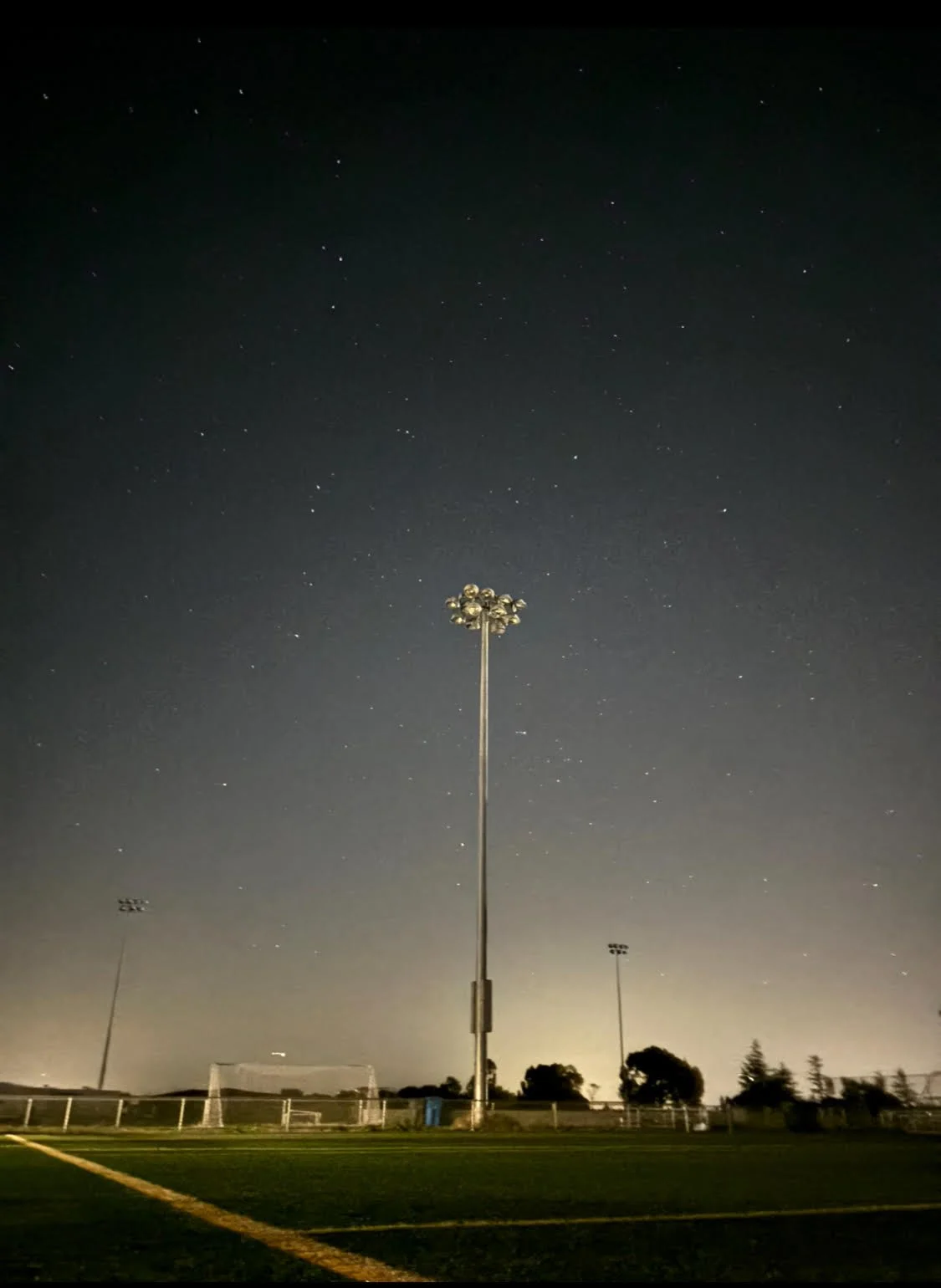 My artwork is a light pole in the late night sky surrounded by the night of the stars. While having the last glimpse of the sun just in the view. This photo was taken after having soccer practice in the night under the light poles view. Staying after they were even turned off and everyone left.