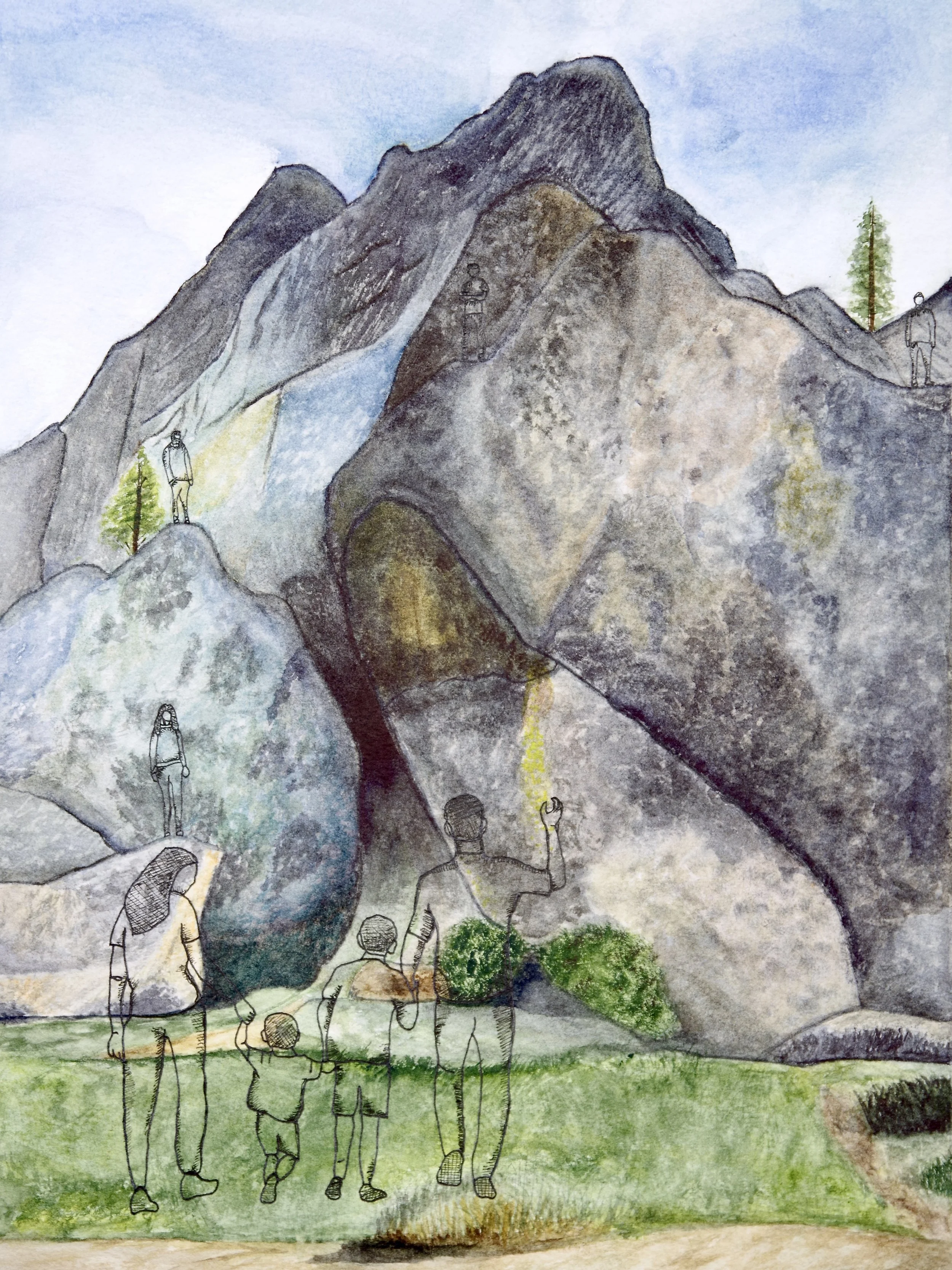 My painting is a painting of breccia, which is formed when lava erupts explosively, causing pieces of rock to break off a volcano and scatter. When the lava flows down, it picks up these pieces and cements them together into new rock as it cools. This rock is breccia, rough like sandpaper and filled with broken fragments of other rocks. I painted this because I felt like this can be a metaphor to how my family was when fleeing Cambodia due to war. There were many lost relatives acting as these small pieces of rock scattered around lost & cemented together when they were finally reunited again.