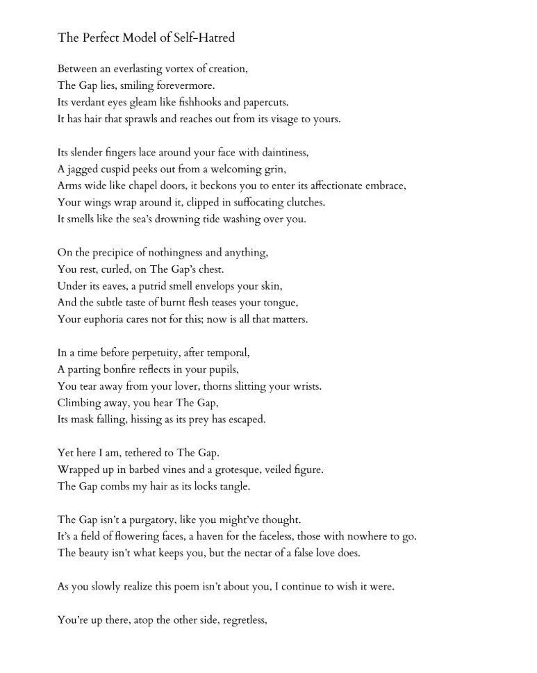 To long for the space in between, to yearn for a space without expectation and that self of yours that you have many a qualm with. That is to entangle yourself in The Gap. The Gap is what an idealist carves their clay world with. A place with no good nor evil, just a space, that is all that it is, because it is all that you need.
