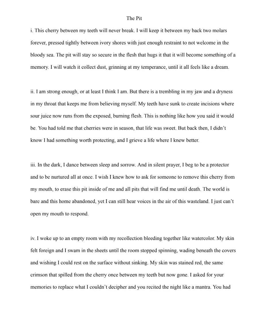 Cherry pits to me have always felt like they are nothing but problems to deal with. They keep you from truly enjoying the sweetness of the fruit by providing an inconvenience to your life. I wrote this piece about the helplessness of having a problem thrust upon you by another person and the loneliness that comes with being taken advantage of. TW: references to sexual assault.