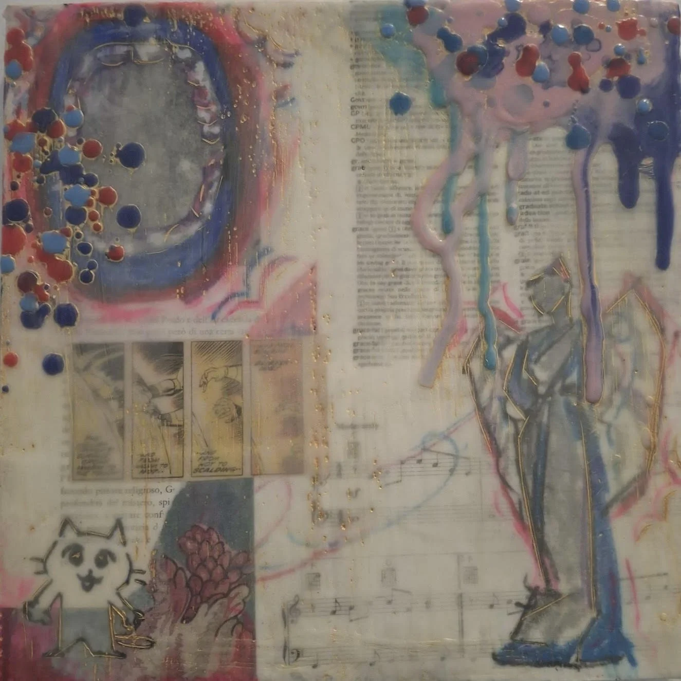 Wax, paper, fabric, acrylic paint, marker, oil pastel, and oil paint