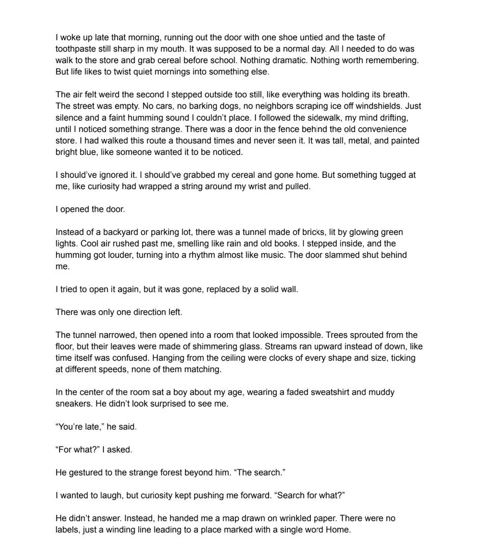 The Strange Forest is a fiction piece about an ordinary day that suddenly becomes mysterious and unfamiliar. I wanted to explore how a simple moment like walking to the store can turn into a journey that challenges someone’s sense of reality. In the story, the main character steps through a hidden door and enters a shifting world filled with strange sights and unanswered questions. This forest represents curiosity, fear, and the feeling of being pulled toward something bigger than yourself. My goal was to show how adventures often begin without warning, and facing the unknown can reveal more about who you are. The story mixes everyday details with surreal imagery to create the feeling of stepping into another dimension. Overall, this piece is about discovery, courage, and the mystery of choosing to follow a path even when you don’t know where it leads.