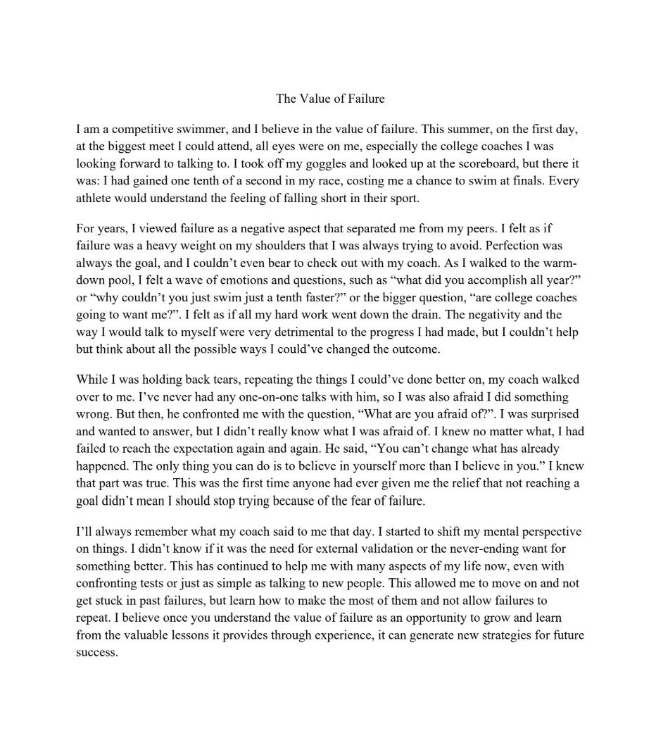 I believe in the value of failure—an understanding I earned on a pool deck when an outcome didn't go as planned. In that moment, I confronted not just my disappointment but the weight of my own perfectionism. That point in time flipped my perceptions on progress, effort, and self-expectation. Instead of looking at failure as an endpoint, I began to see it as the starting point to which growth is possible. Ultimately, this work grows out of the recognition that many teens struggle to deal with failure, but failure is not evidence of inadequacy, it is a catalyst for learning and reflection. I want to honor that process; even if my version of failure may not match with anyone else's, I want to show that it's an experience that is deeply personal, yet universally human.