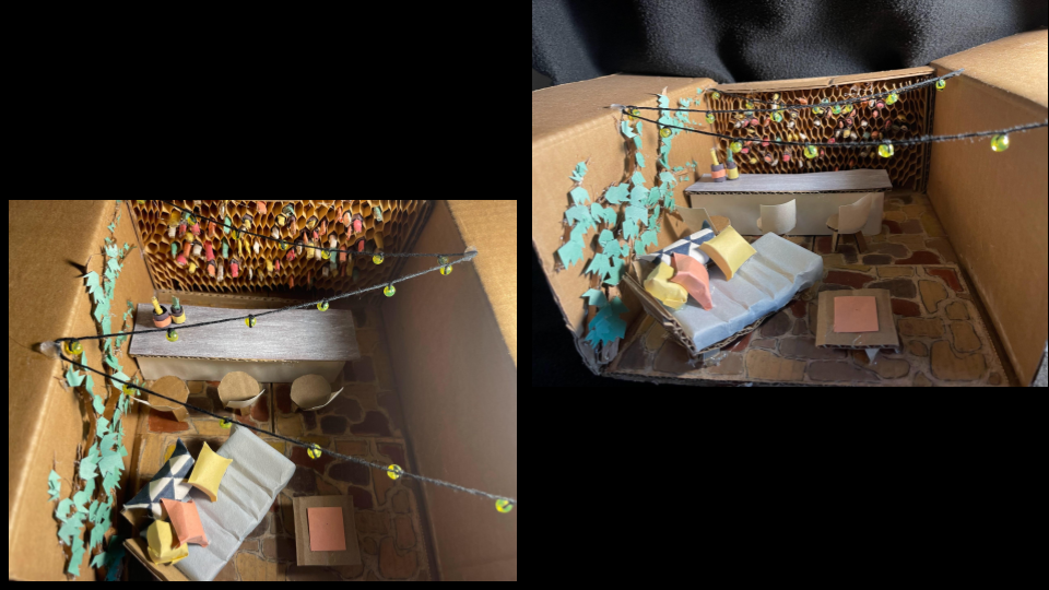 The room is made entirely of repurposed packaging material and paper. The floor tiles were colored with pastels, and the string lights were made from colored beads and thread.