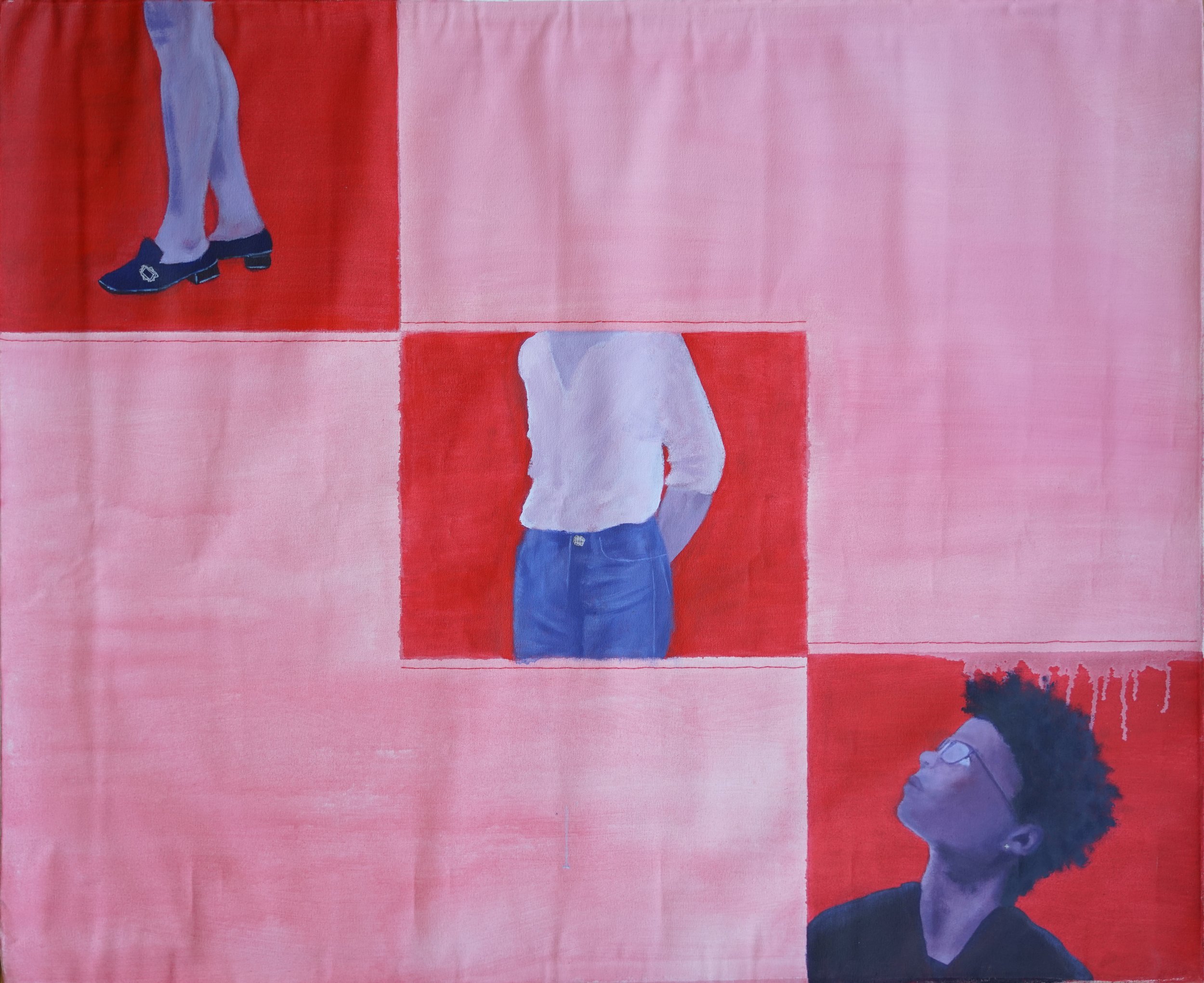 This piece considers 3 moments in time, connecting queer life across history in the Bay. I realized I was transgender in 2020; my reference for the self portrait was taken in 2021. I was in 5th grade, newly back in school in-person during Covid, and I had lost formerly close friends in the aftermath of coming out combined with the isolation of quarantine. The two upper sections of the piece are based on photographs by Crawford Wayne Barton: the legs from Castro Street Fair 1977, the torso from Castro Street in 1979. These separate moments come together to form one body, one whole, connected by thread. Each part features a metal detail in embroidery thread: a buckle, a button, an earring. My 5th grade self looks up towards fragments of queer existence in the Bay – these queer pasts inform my queer present, shaping who I am and who I’ve been.