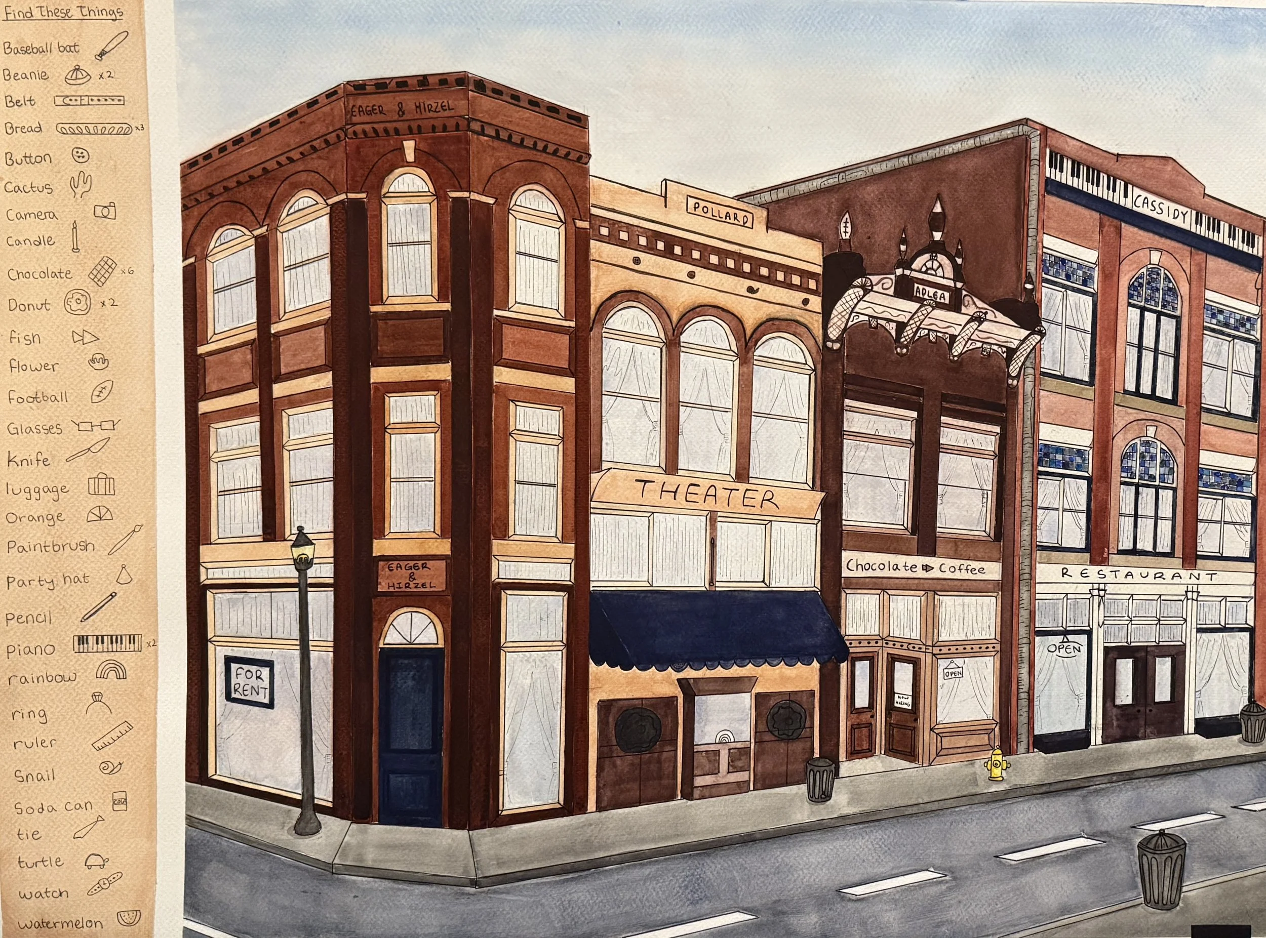 I got inspired to create this piece during my stay at the emergency room. When everything felt loud and chaotic, and I was trying not to let my worries take over. Focusing on an Ispy artwork helped me calm my thoughts and took my mind off my troubles. I wanted to create an art work that would help bring fun and joy to others during their difficult times. I choose to draw a street scene because we spend so much of our daily lives rushing to our next destinations without really looking around. We pass by so many small details without even noticing them. When we slow down and look a little deeper, we can find things that are special or out of the ordinary, even in places we see every day.