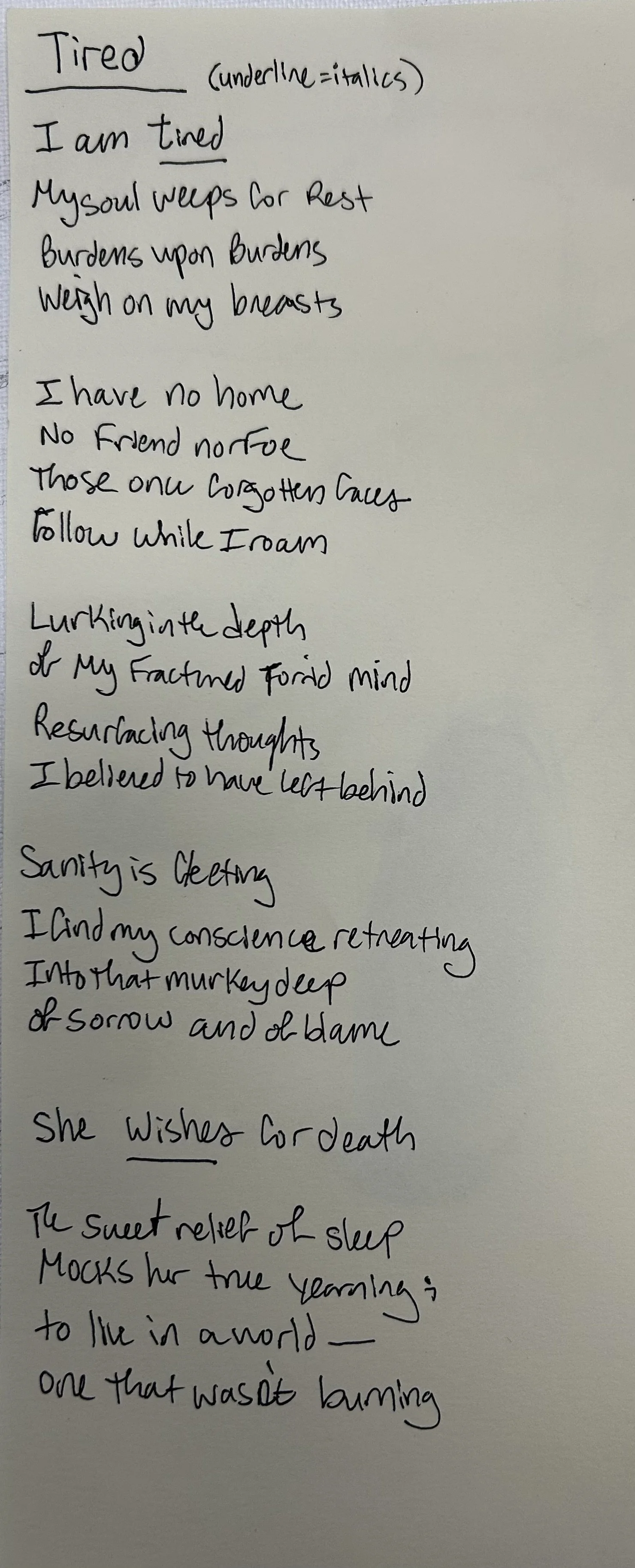 This poem captures the feelings I had during the first few weeks of Junior year. I felt incredibly alone, lost, and, like the poem states, tired. I started this piece in my car one October morning -- scribbling a few words -- to then have completed it nearly a month later. Writing is my outlet, my refuge; only the scraps of notebook paper know the truth.