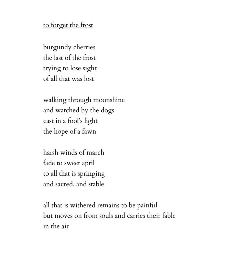 When good things come, is it best to believe in them, or to be skeptical? This question is examined in the poem, to forget the frost. It expresses the human desire for hope, and how that hope can often be cast away as naivety. Optimism thrives in the spring; the sunny and sweet parts of our existence. But when we’ve felt the darkness of winter before, can we maintain our trust in the sun?
