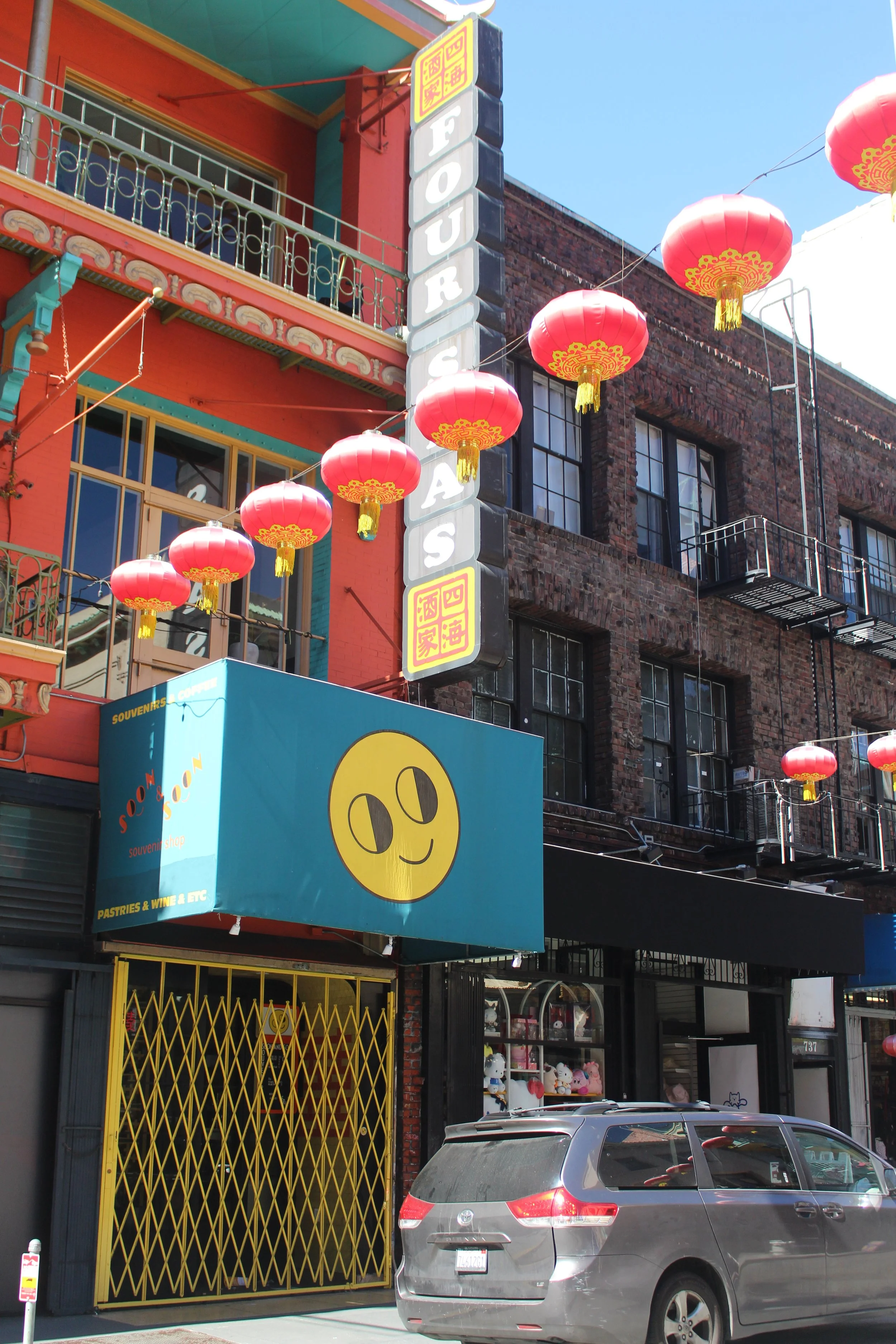 This photo captures a vibrant expression of cultural identity through the bright red lanterns hanging above the street, a symbol commonly associated with celebration, community, and good fortune. The lanterns create a sense of unity, connecting one side of the street to the other, showing how traditions can weave through everyday spaces. The mix of architectural styles, with older brick buildings standing beside more modern and colorful storefronts, reflects how culture evolves while still honoring its roots. The lively colors, signage, and decorations show a neighborhood shaped by the people who live and work there, each contributing their own traditions and stories. Even small details, like the cheerful smiley face or the carefully arranged displays, add personality and warmth, suggesting a community that embraces joy and creativity. Overall, the photo highlights how culture is carried not only in major celebrations but also in the details that bring character and life.