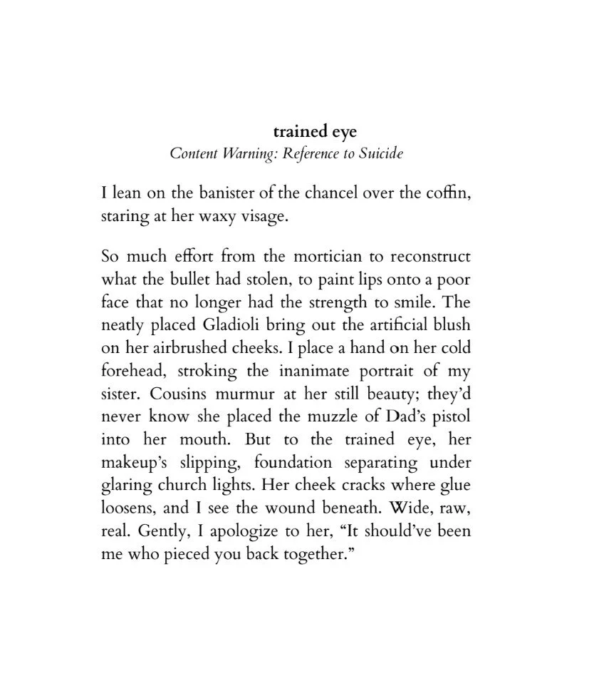 This work was inspired by a piece of my mother’s trauma. At around 13, she attended her stepfather’s funeral, and I imagined, as she peered into his open-faced casket, how it felt to be one of the only people who knew exactly where his gunshot wound was. This piece is dedicated to my mother, her family, and my step-grandpa, whom I never got to meet.