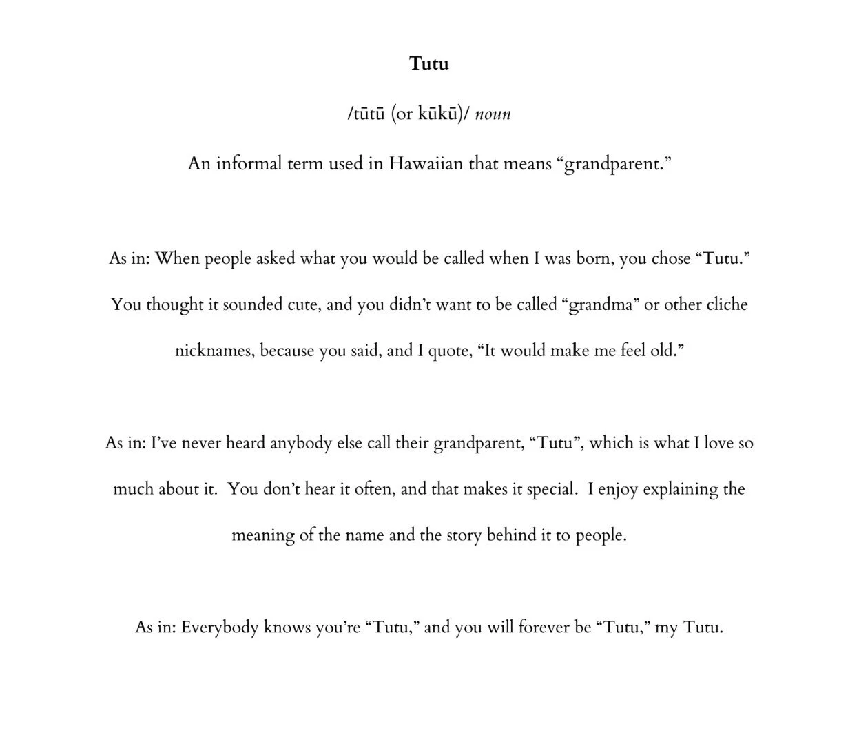 After unexpectedly losing one of my grandmothers (whom I was very close to), I wrote a poetry portfolio dedicated to her. I chose these two pieces, entitled “Tutu” (a definition poem) and “Happy Birthday” (a free verse poem), because they greatly encapsulate feelings often associated with grief—sadness, reminiscing, wondering, etc. These poems can be relatable to those who are dealing with, or have dealt with, similar situations, and bring comfort in knowing they are not alone.