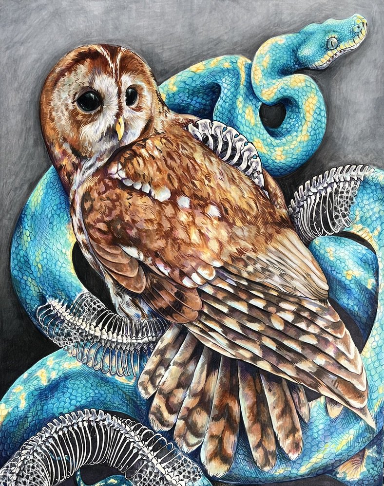 putting an emphasize on the un-anthropological animals; this piece brings to light the beauty of the natural world without a human influence: Utilizing vibrant colors, intense textural differences, and surrealist elements playing with life and death, this piece balances all of these aspects into a exiting and harmonizing artwork. The multi media used in this drawing allowed for layering and play while still bringing out the translucence of alcohol markers, the opacity of colored pencil, and the intensity of pen.