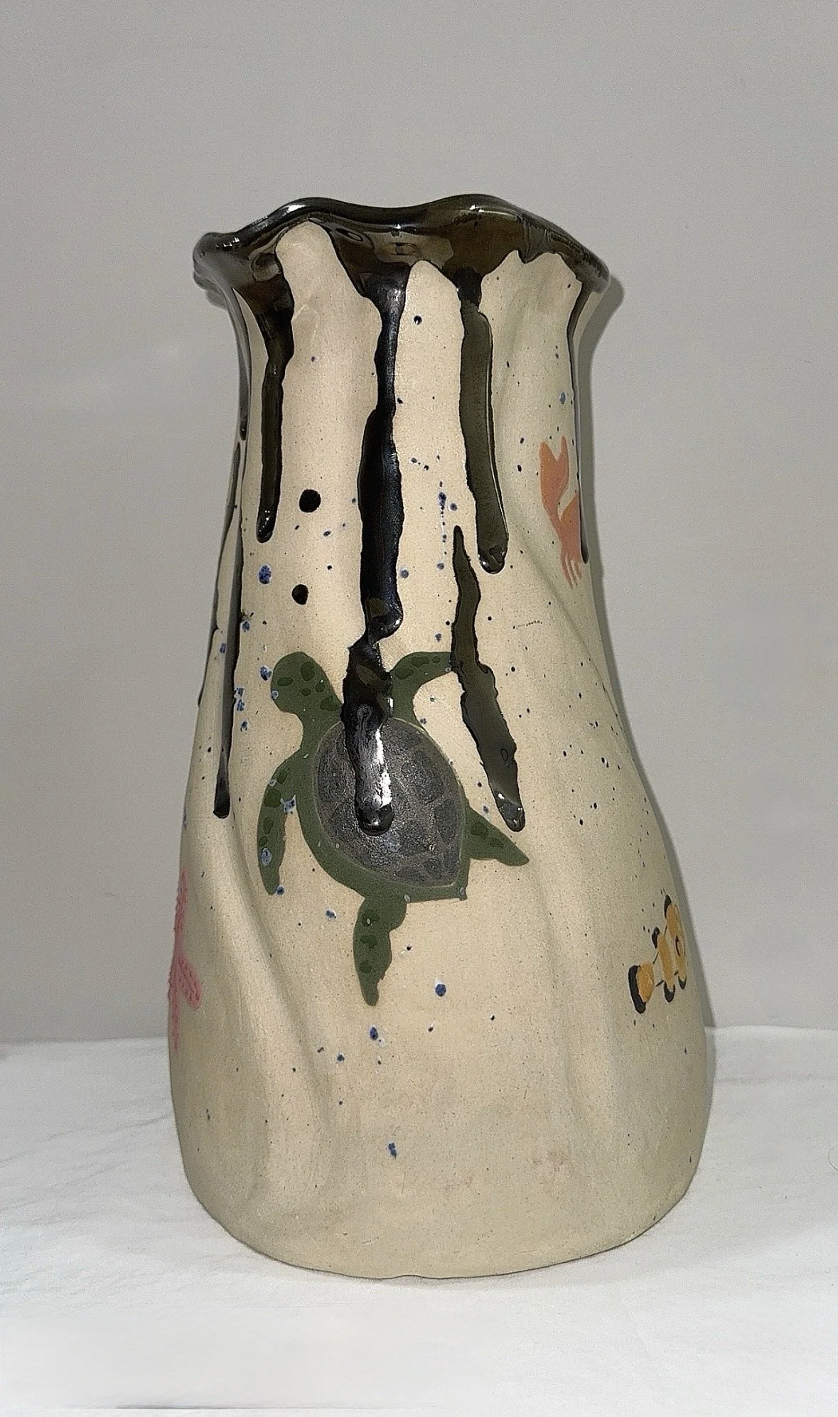 In Under the Surface, I want the viewer to realize how pollution, especially oil spills, affects sea life. The piece shows sea life with oil flowing down on top of them representing how pollution slowly encases and ruins the world we live in. I was inspired by the general idea of pollution and its influence on the world even when unseen. I built the form using coils and smoothed it out, then added underglaze to create the sea creatures. Then finishing the piece with the drips of palladium glaze. Smoothing out the coils was the most challenging part that I faced since the clay had dried considerably, which made it harder to shape and blend. The lesson learned from it was the importance of timing and keeping the appropriate level of moisture for the clay while working on it.