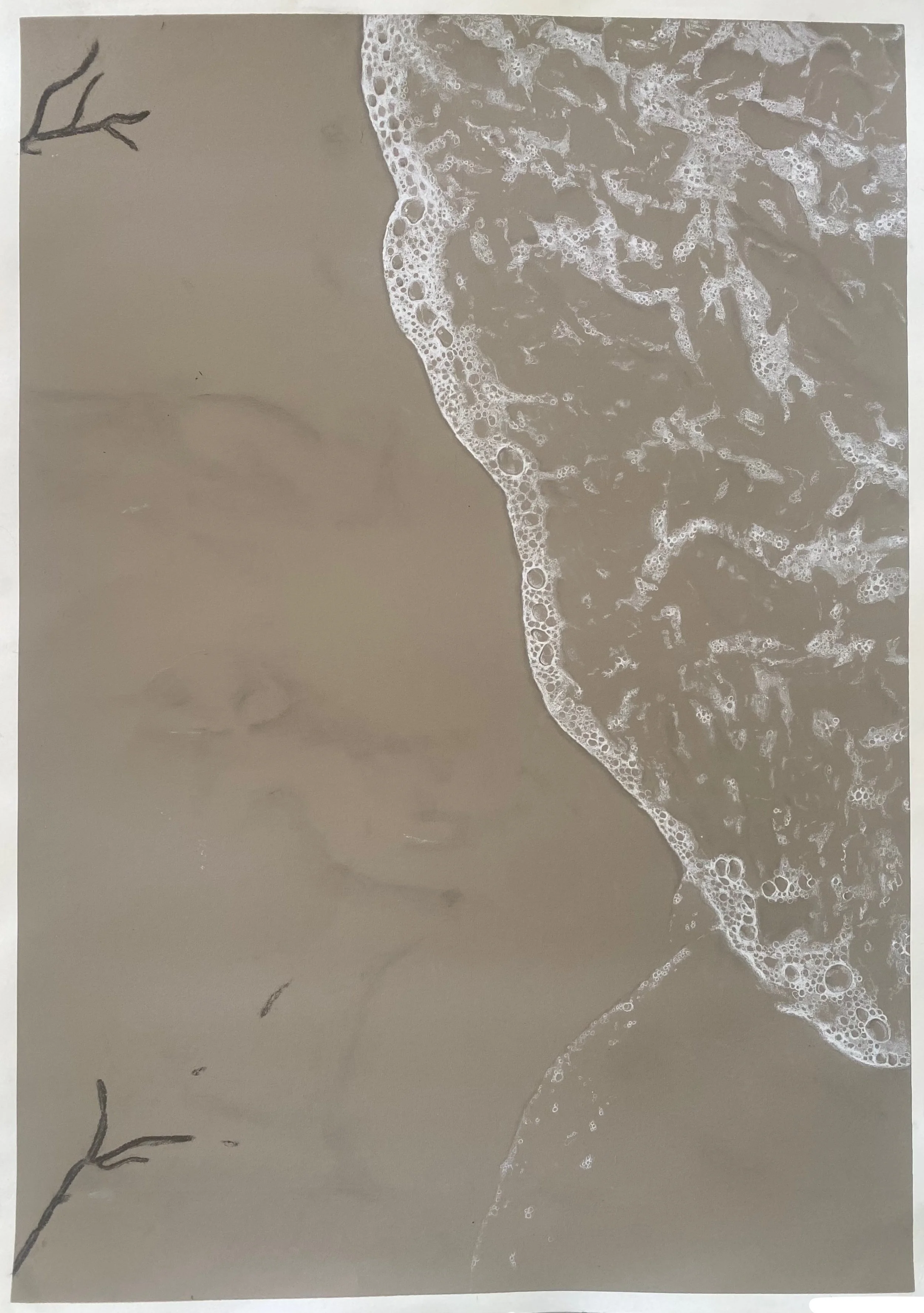 I have been lucky to experience the beach and ocean throughout my life living in the Bay Area sailing in and around its waters. I created this piece to express the simplicity and calm of the ocean on surface level, compared to my perspective as a sailor. Being on the ocean, I am familiar with the river-like currents that flow underneath the Golden Gate Bridge, the incredible marine life, and the terrifying experience of being in heavy wind, huge waves, and disorienting fog in the middle of the Bay. I used this piece to express the contrast between the perfect calm and peace of the ocean that I see everyday compared to the undertow I know extends throughout the coast of California.