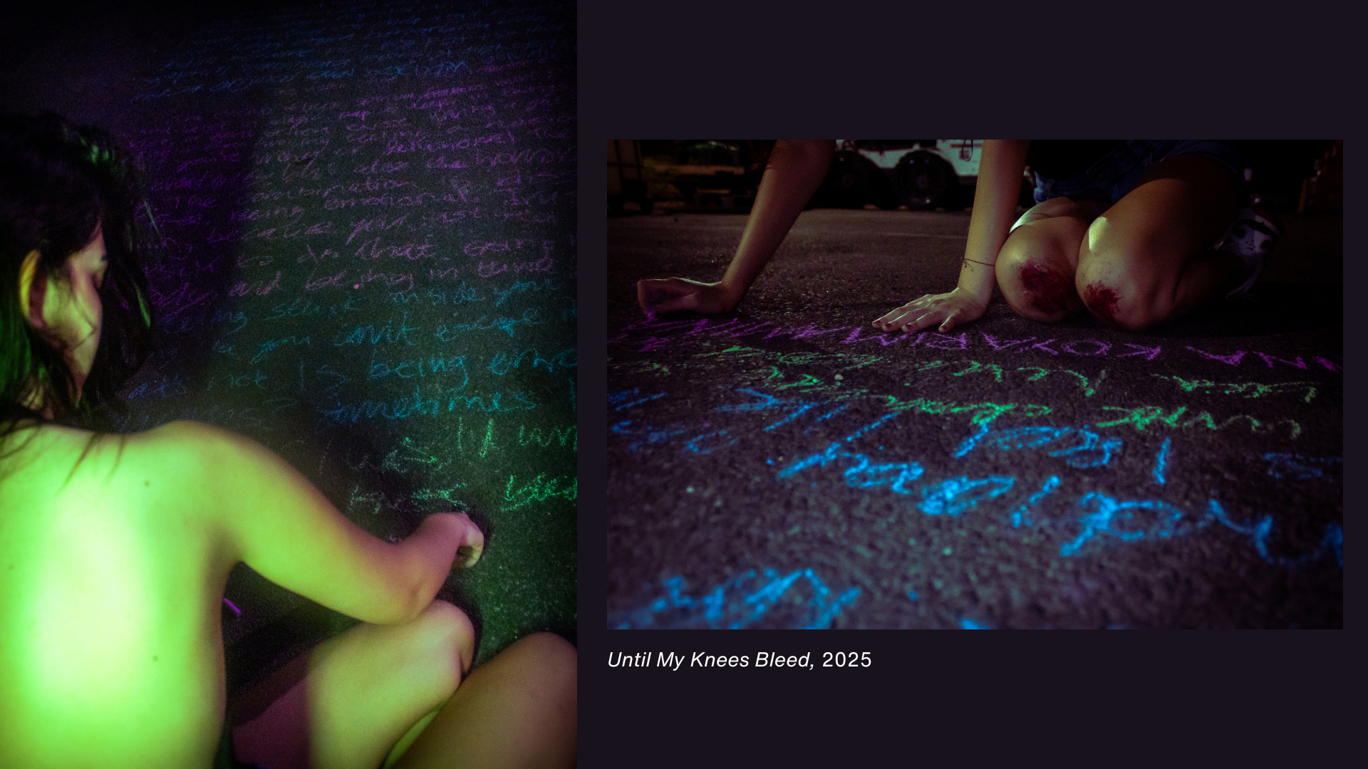 It seems widely agreed upon that being emotional is on the same level as believing in unicorns. It’s too irrational, disconnected from reality, too childish, winded, and lengthy. But that metaphysical space between mind and language, I’d like to go there for a while. I’d take to chalk to the streets and write for miles until my knees bled. I wonder what’d happen if we could hang out there together. This piece was inspired by a series of unabbreviated, unpolished written works of mine exploring irrational and unproductive questions, feelings, and visions. I urge viewers to consider the things they’ve felt but didn’t say, or expressed but condensed. Might we connect with one another better if we condensed ourselves less?