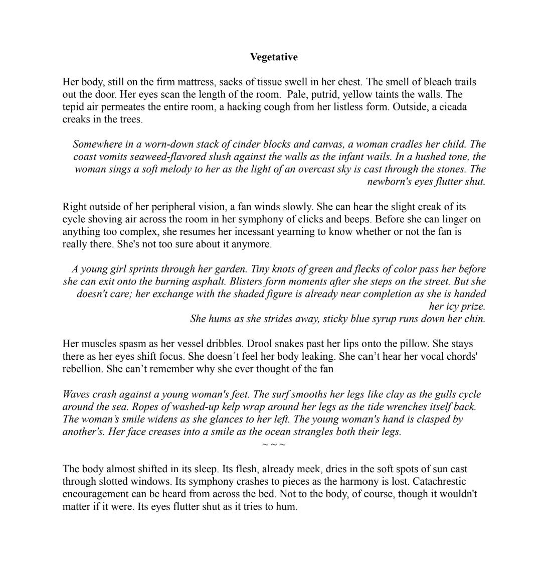 I often write about people losing themselves to diseases that debilitate the brain, which my piece is certainly guilty of. Whether it stems from the long list of family members I´ve seen take such a path, or my childlike fear of following them matters little in compared to what I convey through each piece I write. Vegetative is no different, it is a small example of my fears and love for those who have gone past remembering.