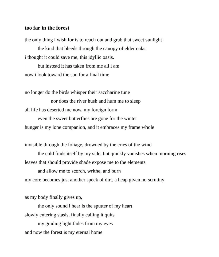 These two pieces explore the connections which occur through nature and nature's relationship with people. The first is an abstract psychological exploration of struggle and survival, while the second is more personal, using nature as a facilitator to explain complex relationships. Though written in different narrative perspectives, and covering different topics, there is an underlying bond which is created through the way nature is interpreted in both poems.