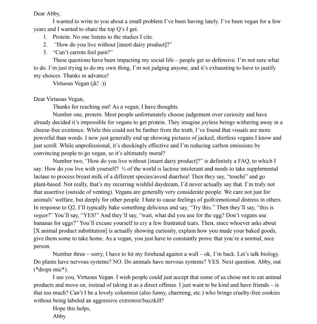 I've been vegan for a few years and there are several questions I regularly receive that can be frustrating to answer. I also happen to be a hopeless advice column enthusiast. This fictional Dear Abby exchange with "Virtuous Vegan" (intended to satirize many people's perception that vegans are holier-than-thou egotists) is born of my own exhaustion over answering these questions. It can be truly tiring (and isolating) to justify a dietary decision, and I've been shocked at the reactions I receive for merely mentioning I’m vegan, ranging from defensiveness to borderline aggression. While this piece pokes fun at unthoughtful questions, truly nothing makes me happier than when someone engages me with genuine curiosity. Additionally, humor is a tool I use in my creative writing that has helped me improve my own curiosity. I hope that in bringing levity to people’s perception of vegans, I can pass that same curiosity on.