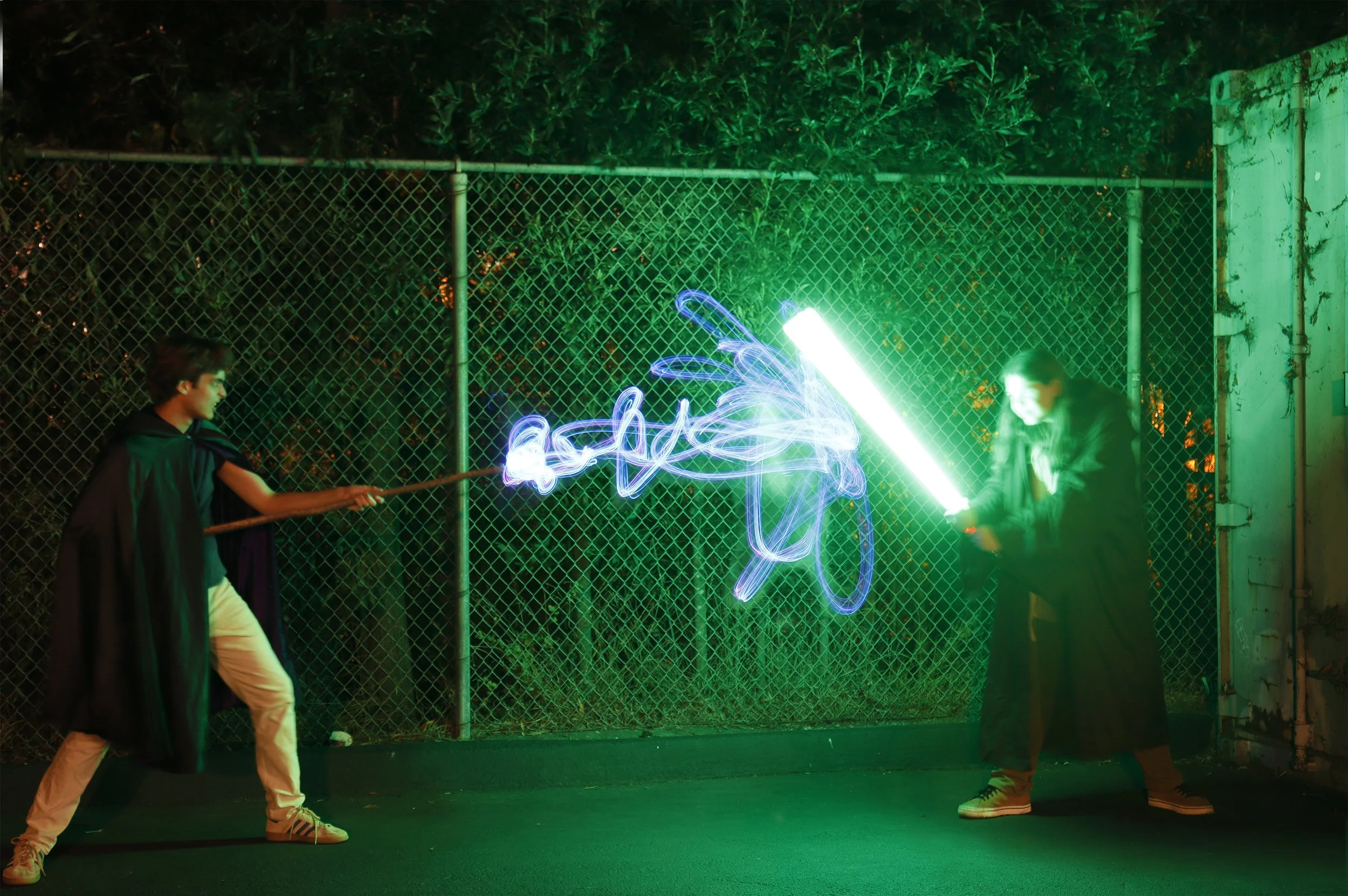 My goal with this photo was to capture the energy of little kids pretend. A simple and nostalgic kind of fun. It reminded me of when I was a kid, dressing up with my friends, imagining we were wizards or jedi and making up stories. The contrast between the figures showing the wild creativity of a child's imagination.