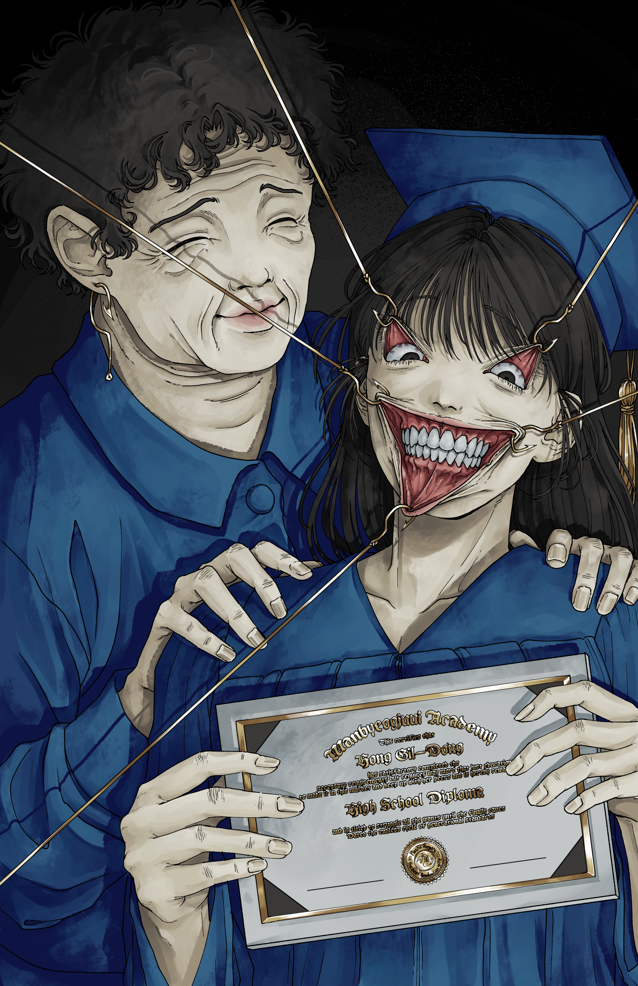 For this piece I covered generational trauma and the concept of plastic surgery as a graduation gift. This work was inspired by my own experiences with beauty and being questioned about what my graduation gift would be, something I never considered possible. The mother’s hands on the daughter symbolizes her expectation for the daughter to carry the weight of her beliefs confiding into beauty standards. Paired with the mother’s fishhook earrings, reflecting how the mother, too, was a victim of such standards, this reflects an internalized belief that plastic surgery is needed in order to keep up with one’s peers (especially in East Asian countries). Through this piece, I wanted to show these pressures aren’t always from viewing one as “ugly” but rather a sad form of love wanting your daughter to fit in.