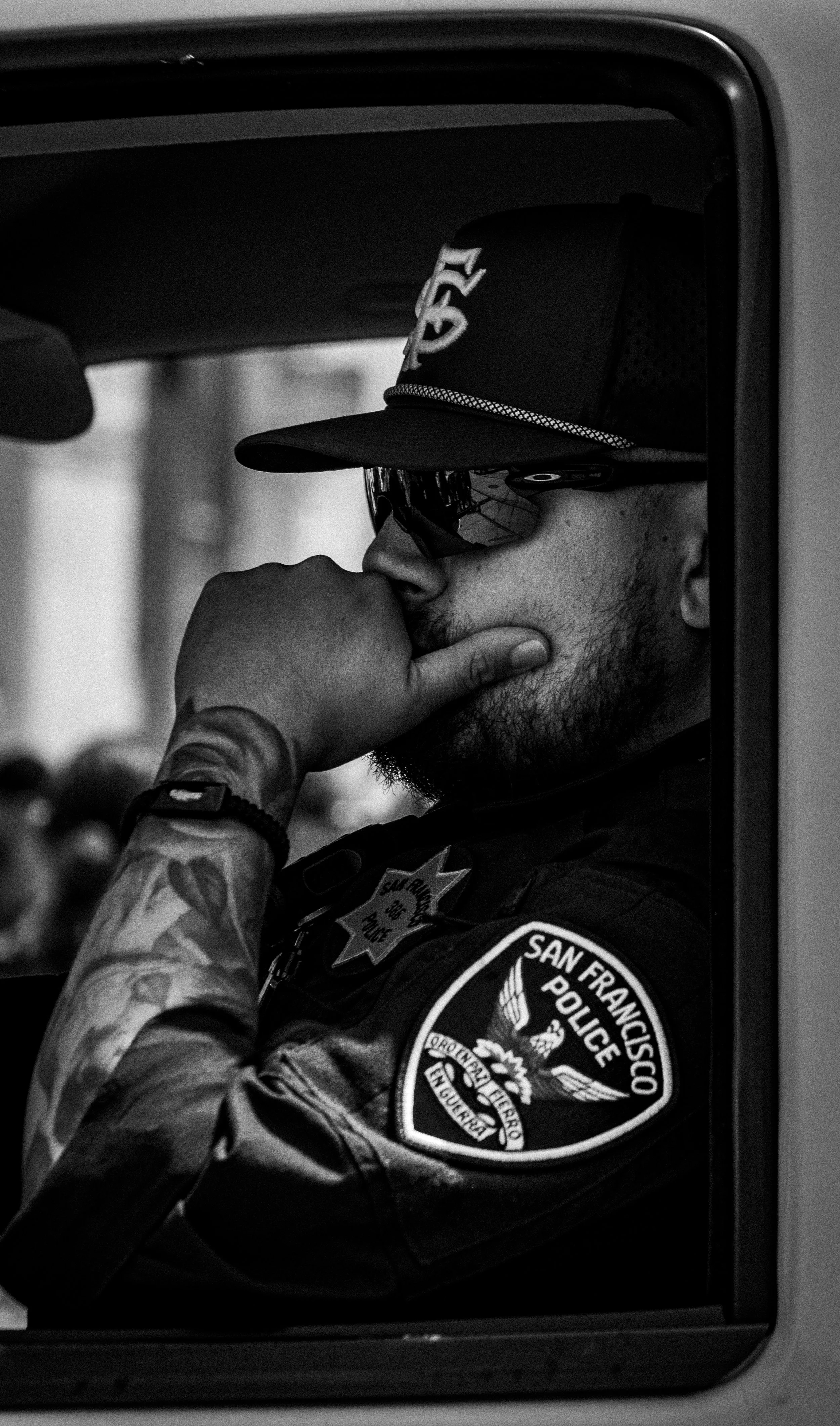 My photo is of an SFPD officer stationed at a protest in San Francisco. I saw him sitting in his car, surrounded by mobs of people, deep in thought. It intrigued me because it seemed that he couldn’t care less about what ever was going on around him and was in his own head. I took the photo as to be ambiguous about what was going on in his head. To let the viewer imagine that for themselves.
