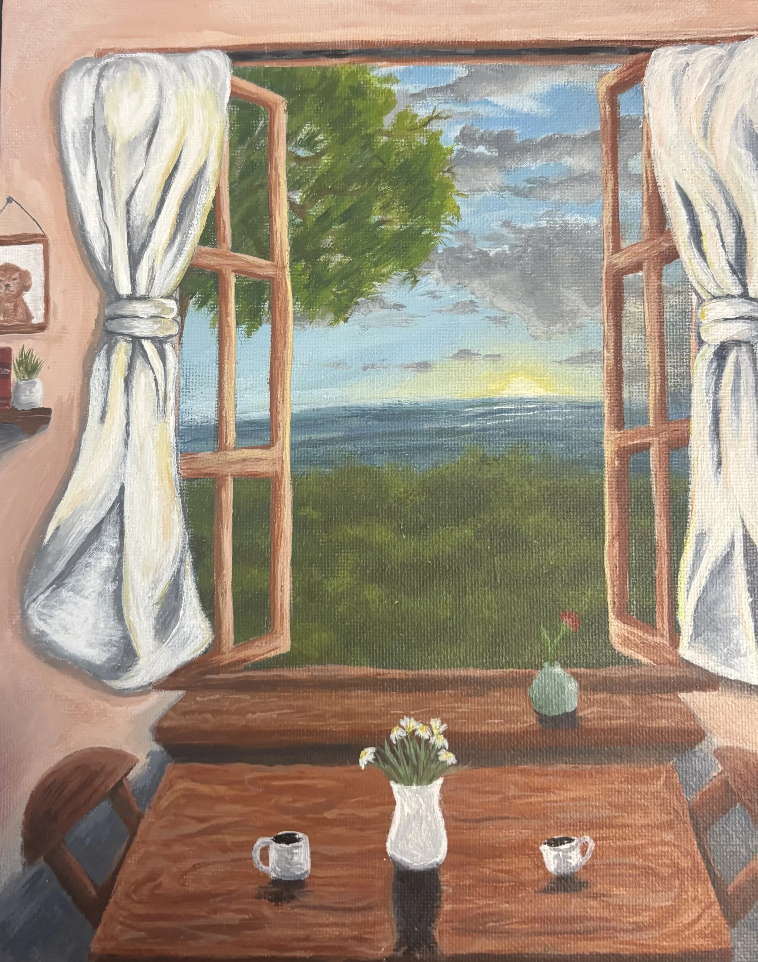 This artwork I made is my idealistic home. I want to live a calm and simple lifestyle, where imperfections are my perfections. The painting isn't symmetrical because I wanted to showcase that things aren't always perfect, but being around those who balance and make our lives worthwhile helps shine hope into our world. The waves and ocean in the background also represent how I wish to see my life in the future, free, open, and endless. I want my opportunities to be extraordinary and everlasting, and I want my freedom to stretch as wide as the ocean, never nearing an end.