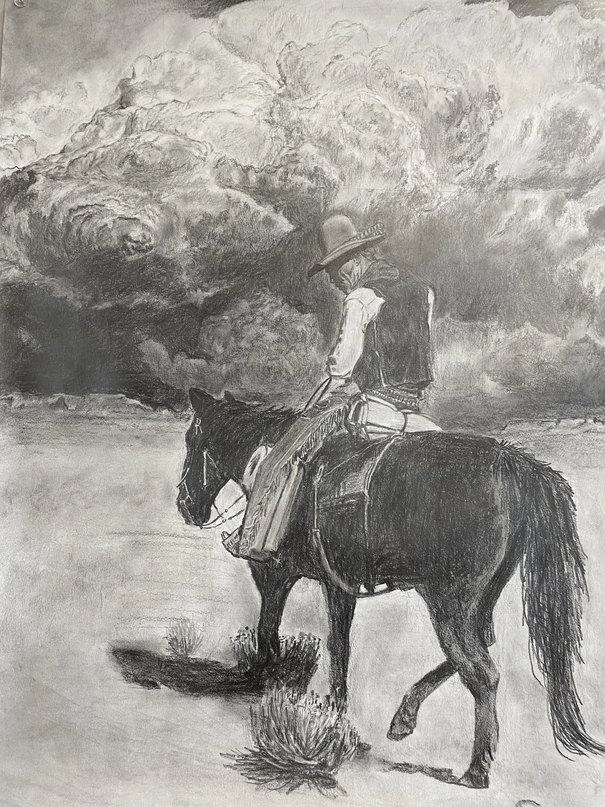 I was inspired to draw this after replaying Red Dead Redemption 2, which is a video game about the Wild West. I used graphite pencils and it took me about 10 hours to complete. If you liked this piece, I recommend checking out the artist I referenced, Mark Maggiori, who makes tons of great oil paintings of cowboys.