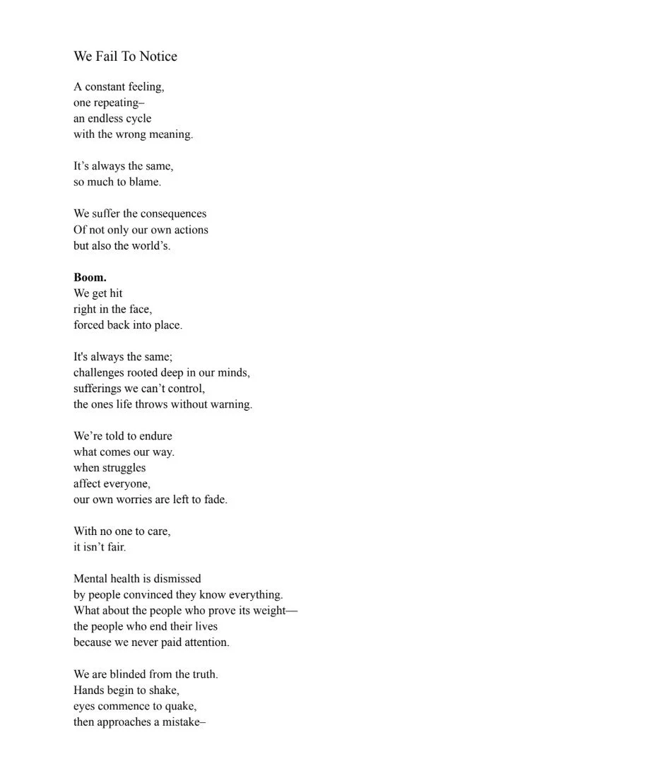We Fail to Notice is about the quiet, persistent pain that goes unnoticed day in and day out. The poem contemplates how mental health struggles are minimized or overlooked by society or individuals, through repetitions and stark imagery. I wanted to capture the looping nature of internal suffering-how it returns again and again, even when ignored. The piece confronts the consequences of dismissal, highlighting how emotional pain can escalate when support is absent. By depicting subtle physical and emotional unraveling, I aim to show the urgency of noticing, listening, and validating others before harm becomes visible. This poem is a call for awareness, empathy, and recognition of battles many fight in silence.