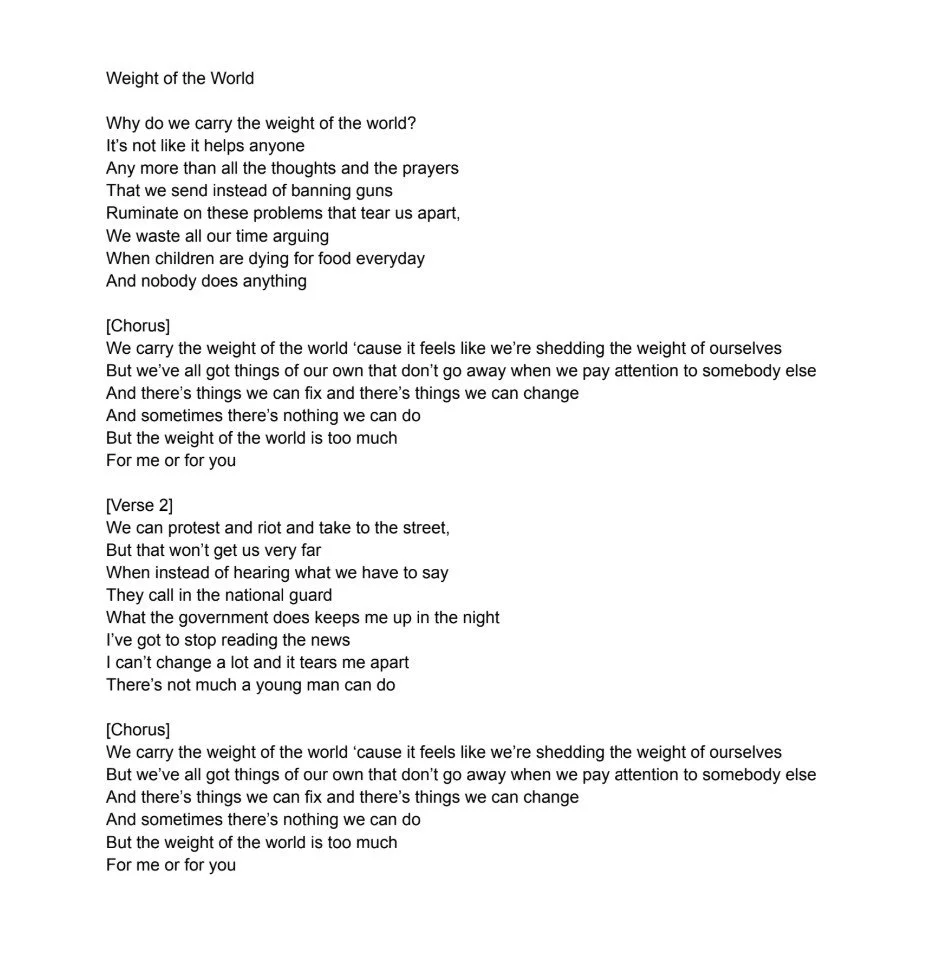 I wrote this song about the whole mess going on in the United States right now. It’s primarily about how I (and I’m sure a lot of other people) have a tendency to carry the weight of the world’s problems, and when we read about some major issue in the news, think, “I should be doing something,” and lose sleep over it. But the truth is, you can’t always solve the world’s problems, and it doesn’t do you any good to worry about it.