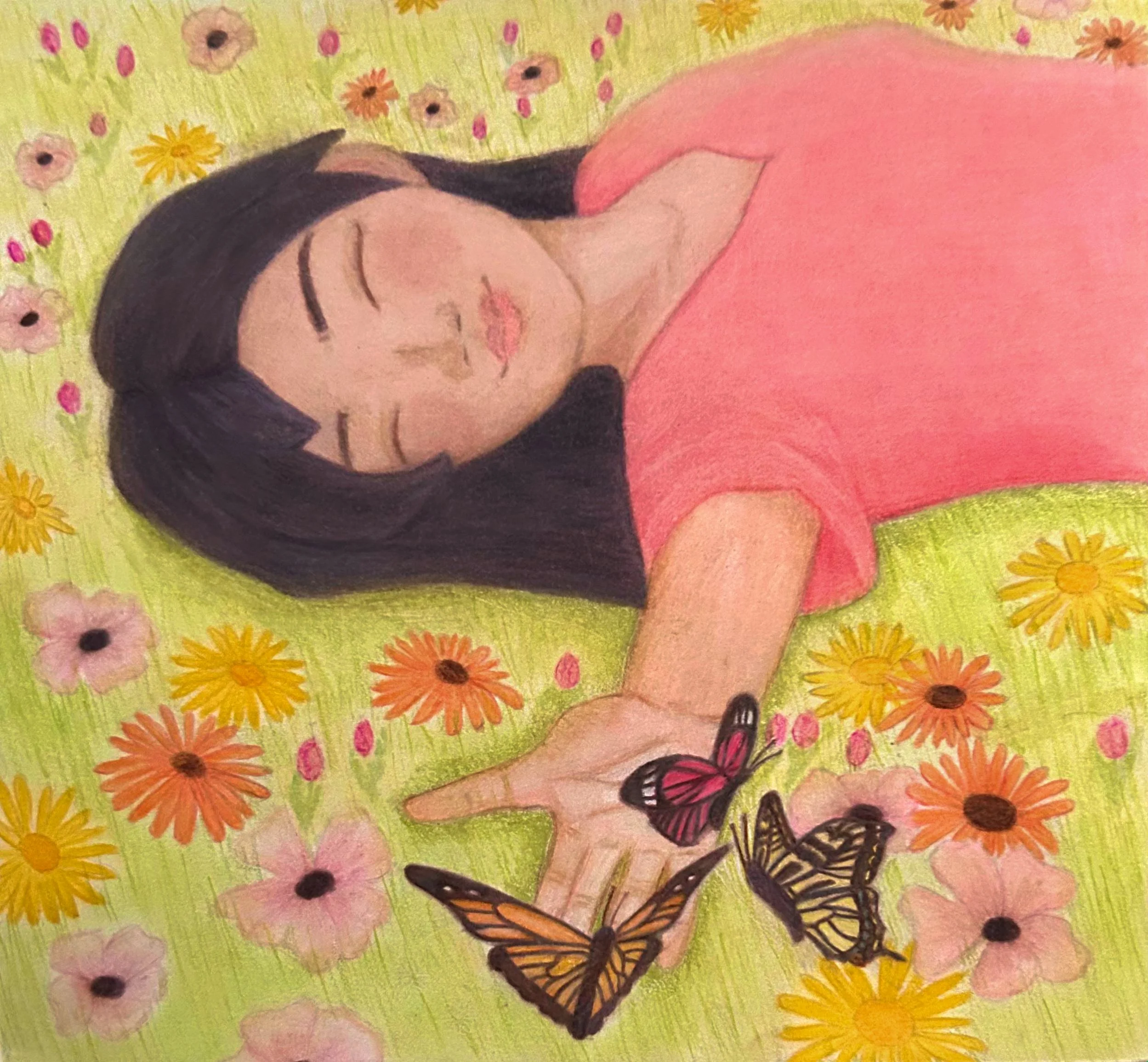 This piece was created using colored pencils on mixed-media paper.