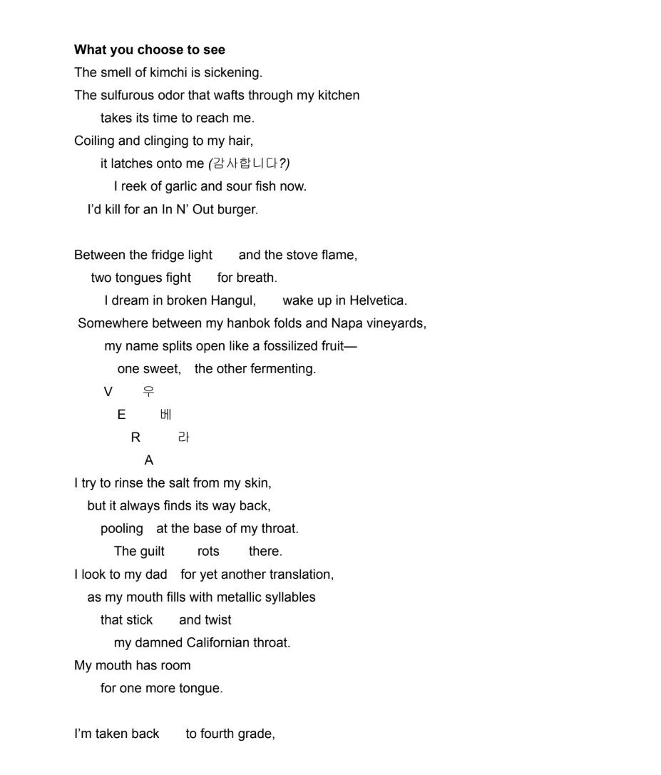 I wrote this poem about my cultural dual identity between my Korean and American side, and how they never seemed to fit together--- like stepping fully into one meant dimming the other.