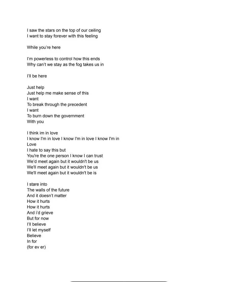 I've been producing music for a few years now, but singing is always something I've been somewhat insecure about. With this piece, however, instead of covering my voice with loads of effects, I chose to leave it clear and unprocessed, fitting the concept of the piece: love. Just as love has helped be gain confidence in myself, this piece is the realization of that confidence, as I experimented with songwriting and layering my own saxophone playing. The melodies throughout the piece represent the progression of holding onto love and confronting the future, through cherishing wistful memories as one is engulfed by the struggles of life, resolving to push forward, and as the main melody of the piece repeats for a final time, breaking free from the past and adapting with the future.