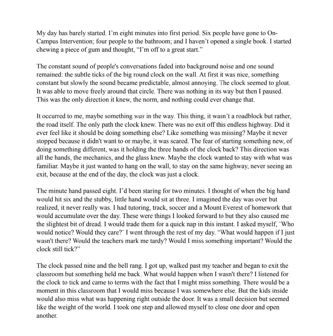 In my freshman English class, we were assigned an essay to show not tell. We were instructed to use two of eight common writing techniques. I thought it would be challenging to try to use all eight: sensory details; body language and physical reactions; strong verbs; dialogue; internal thoughts; specific examples; symbolism and metaphor; and scene specific details. Ninth grade was a time when everything seemed to be changing. It was my first year at Berkeley High School, a school with 3500 students. There were so many new things available to explore. My problem was deciding what. There were clubs, government, sports, the school newspaper. I had trouble narrowing it all down. In some way, I wanted to be like the big round clock but also knew that there was a big world out there and that I shouldn’t be afraid of exploring all it had to offer.