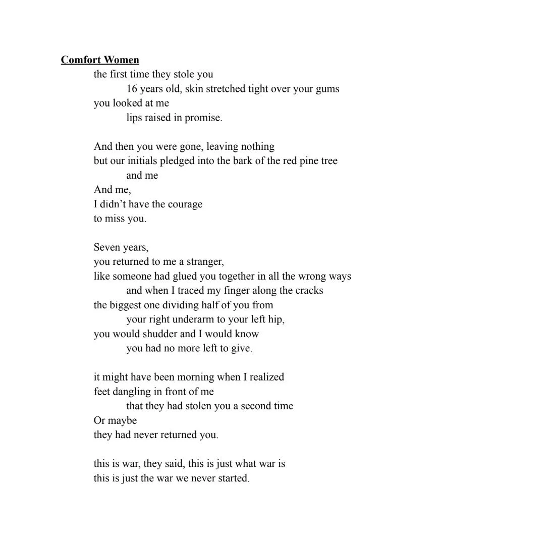 These are two short poetry pieces about being a woman. The first one details the experience of a comfort woman, who were women during WWII that were taken from their families and tricked into sexual servitude for soldiers. It details the destruction that came from that experience.