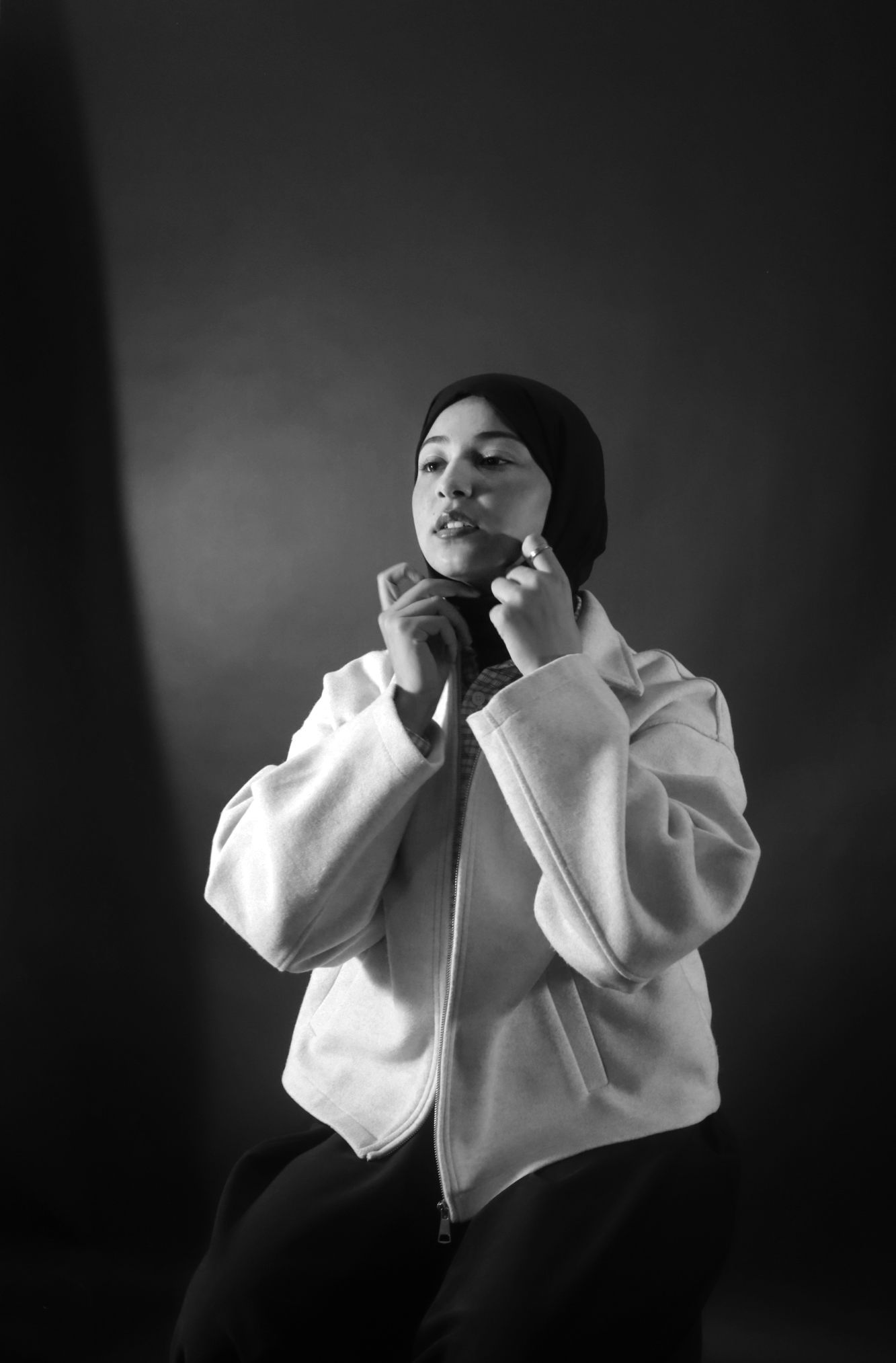 My name is Shouq, a senior at OIHS. My mom used to take photos of me and my siblings using a camera. And at a young age I became interested in photographing places and people around me. The person in this photo is Malak. I met her this year when school started. While we were taking photos, Malak stopped to fix her hijab, and I took a few shots in that unposed moment. Later, I realized that the most iconic photos were the ones I took when she wasn’t paying attention. I used Adobe Photoshop to remove distractions, adjust lighting, and made it black and white. I think this photo is iconic because it is original and meaningful. It uses angles, contrast, shadows, story, and centered. Its message speaks up for women who face challenges because of the hijab, and it makes me feel connected to her in a way.